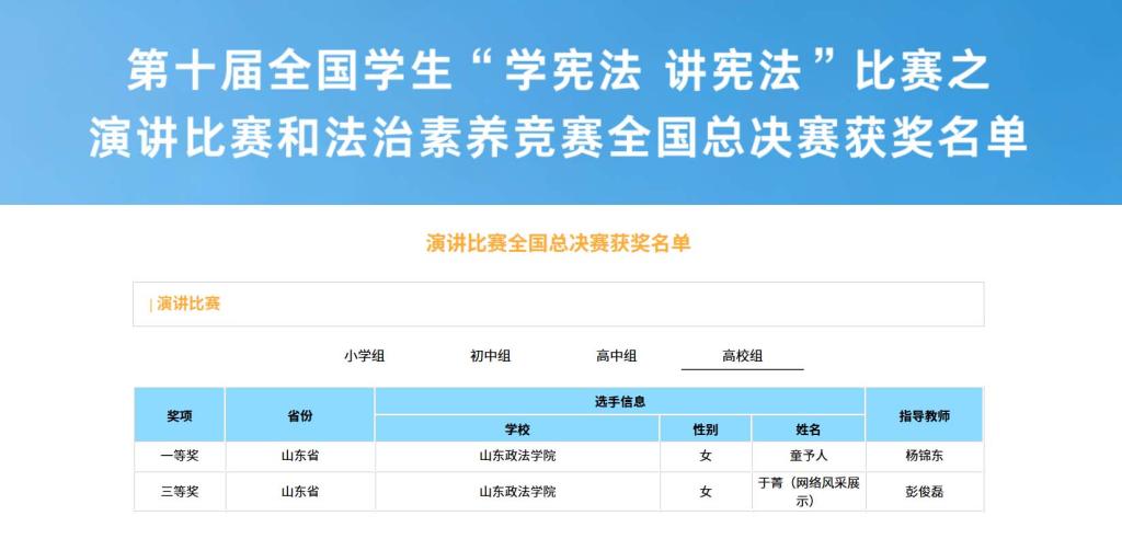 近日,由教育部主办的第十届全国学生“学宪法 讲宪法”活动全国总决赛在北京圆满落幕。山东政法学院经济贸易法学院童予人、警官学院于菁两位同学凭借扎实的宪法知识功底和严谨的法律逻辑思维,在比赛中表现优异,分获高校组演讲比赛一等奖和三等奖。本届赛事中,我校首次实现线上线下双渠道晋级,两名选手入围全国总决赛。